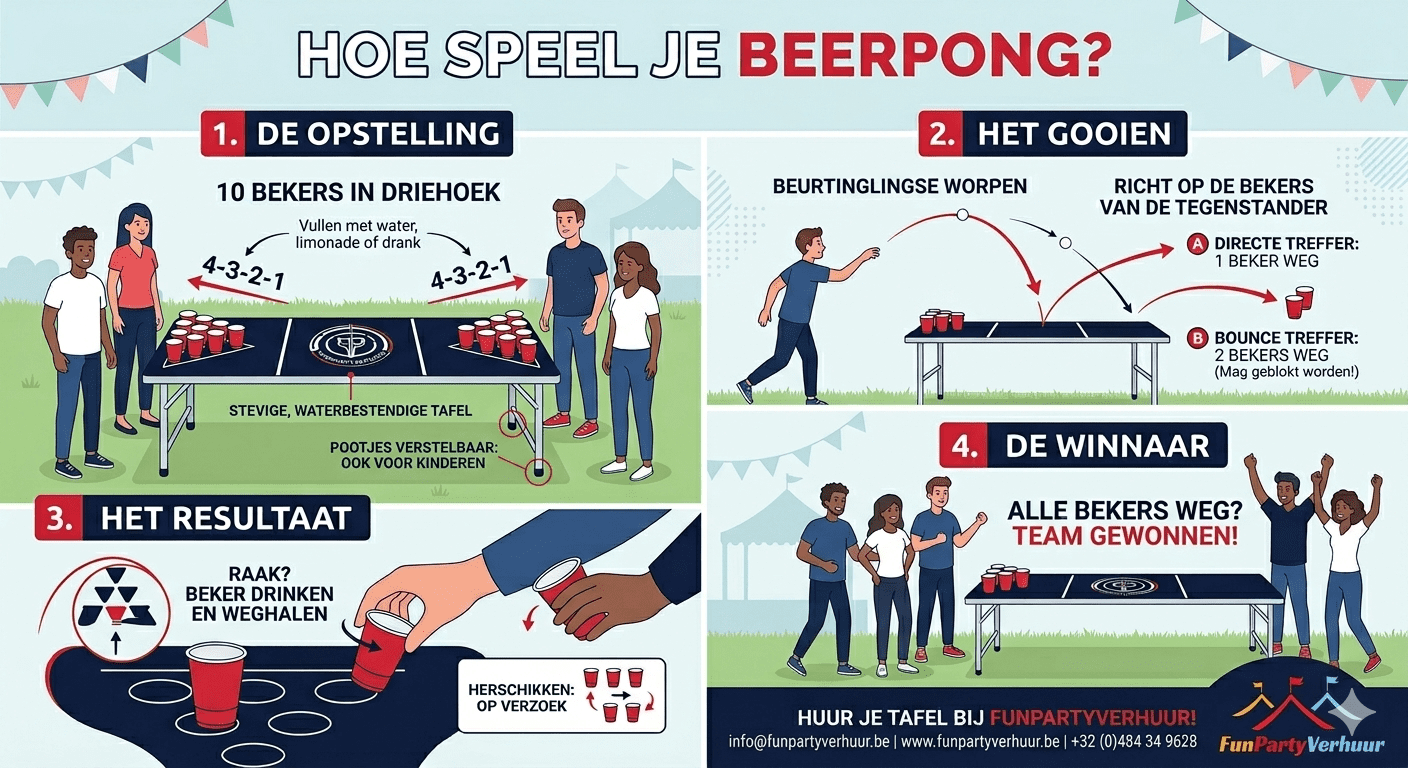 De huurprijs van € 15,- is voor de tafel zelf. Wil je direct aan de slag zonder zelf naar de winkel te hoeven? Wij verkopen een complete set inclusief balletjes en de bekende rode (of blauwe) cups voor 5 euro, zodat je feestje meteen kan beginnen. Deze bekers en balletjes hoeven niet retour.